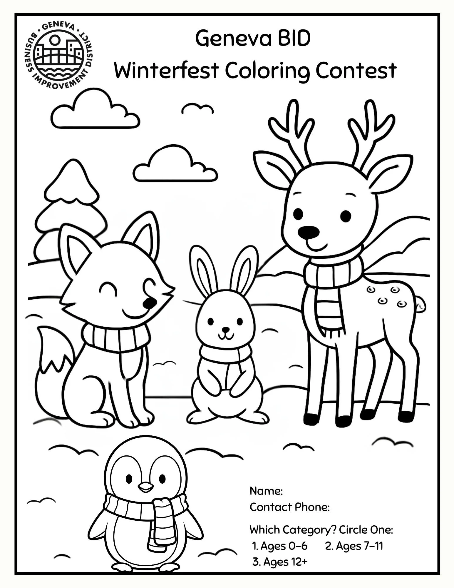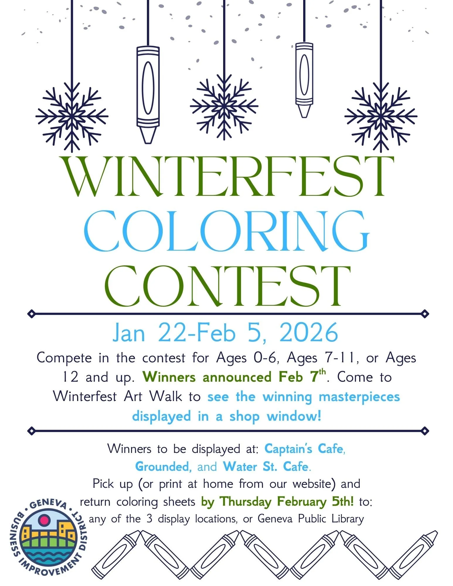 Beginning January 22nd, visit Water St. Cafe, Grounded, Captain’s Cafe, or the Geneva Public Library to pick up a coloring sheet for the 2026 Winterfest Coloring Contest! Complete your sheet and return it to any of the four pickup/drop-off locations by Thursday Feb 5th to enter. Choose one of the three age categories to submit your masterpiece (0-6y, 7-11y, 12+y) and each of the three businesses will select one winner to display in their shop’s window on Saturday Feb 7th during the Winterfest Arts Walk. Winners will receive a prize from the business. Stop by to see the winners on display! (You may also download the coloring sheet here, complete it on your own, and drop it off to any of the four pickup/drop-off locations.)