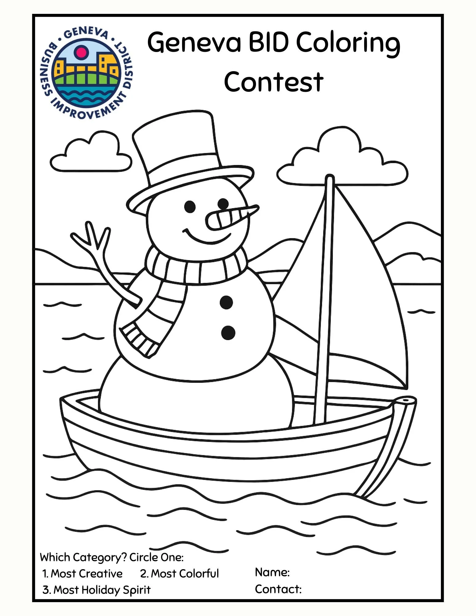 Beginning Nov 22nd, visit Water St. Cafe, Geneva Gelato, Total Recall, or the Geneva Public Library to pick up a coloring sheet for the 2026 Holiday Coloring Contest! Complete your sheet and return it to any of the four pickup/drop-off locations by Thursday Dec 4th to enter. Choose one of the three categories to submit your masterpiece (Most Creative, Most Colorful, Most Holiday Spirit) and each of the three businesses will select one winner to display in their shop’s window on Saturday Dec 6th during the Winter Arts Walk. Winners will receive a prize from the business. Stop by to see the winners on display! (You may also download the coloring sheet here, complete it on your own, and drop it off to any of the four pickup/drop-off locations.)