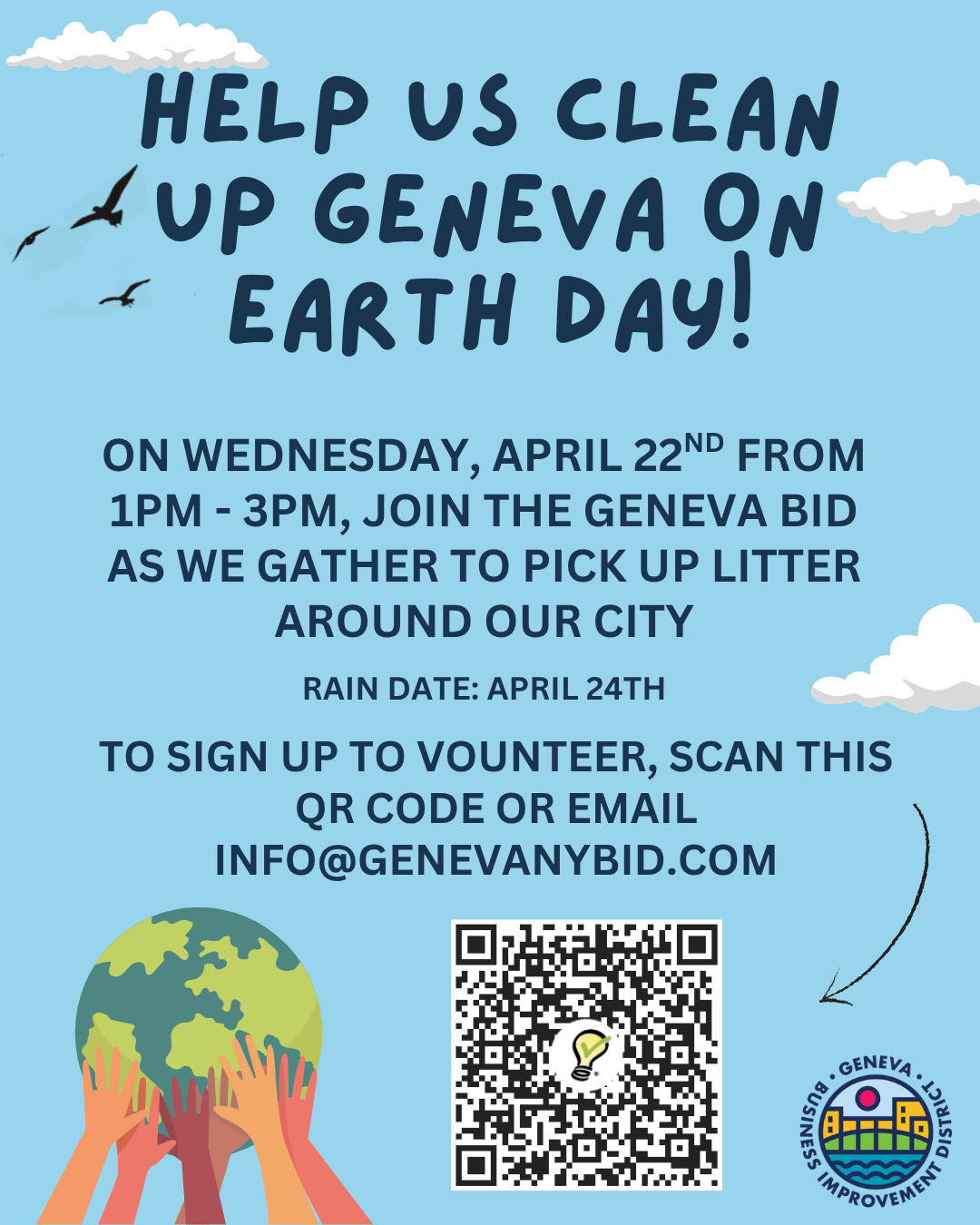 Join the Geneva BID on April 22nd from 1-3pm for an earth day clean up event in downtown Geneva. We will give you everything you need to pitch in! You will also have the opportunity to bring home some free native plant seeds, baby sunflowers and potted willow bushes. Click the button below to sign up.